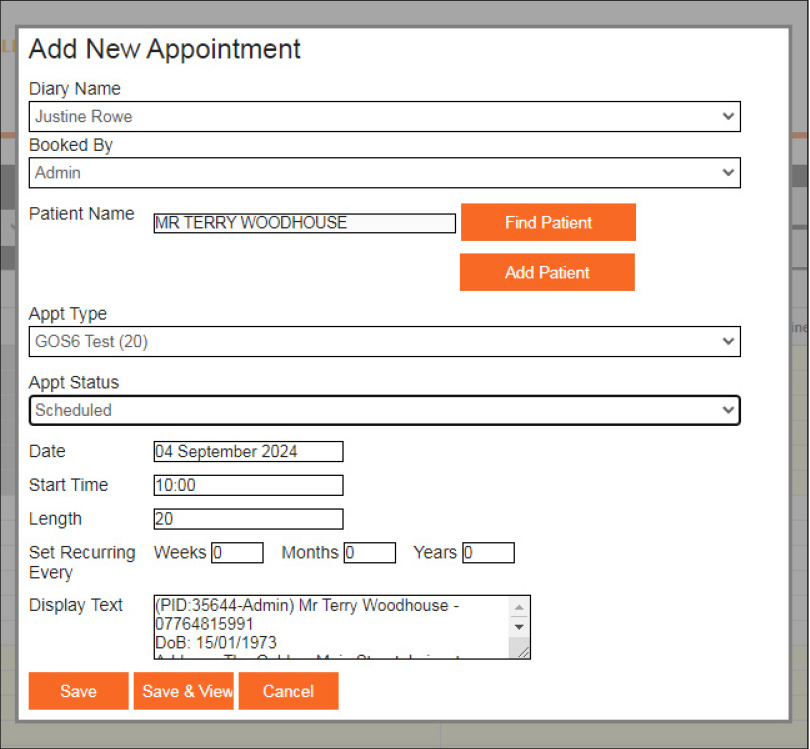 On an available cell double click. (Patient appointments cannot be added to non clinic times – greyed out areas) This will open a ‘Add New Appointment’ window.