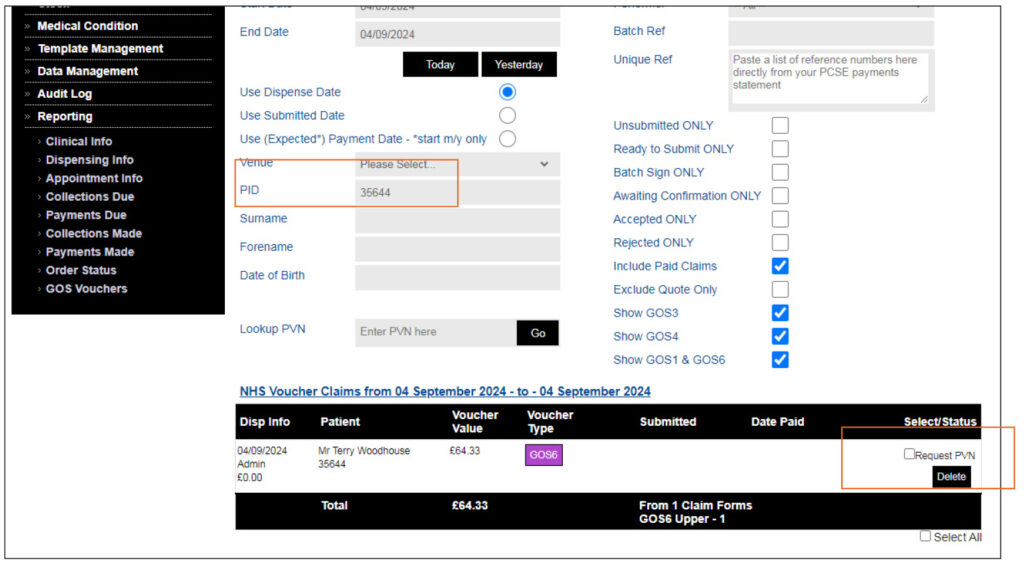 When you are automatically taken to this page the PID will be populated in the search filter and you are able to tick the Request PVN box.