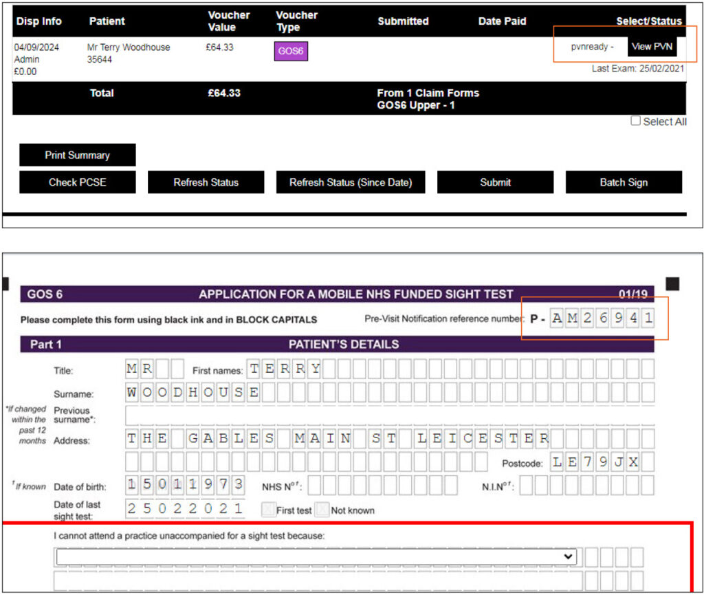 Before a form is submitted you should check that the information from when the appointment was created and therefore is attached to the PVN is exactly the same as the information on the GOS form, e.g. patients name, address and date of birth. If the form is submitted with a different date of birth or spelling of their name for example, the form will be rejected.